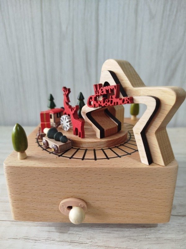 Cajita musical a cuerda, confeccionada en madera de haya, con una excelente terminación, totalmente suave al tacto. Sus medidas aprox. son 11 cm x 11 cm x 12 cm de alto. Al girar la cuerda (no lleva pilas) suena melodía navideña.