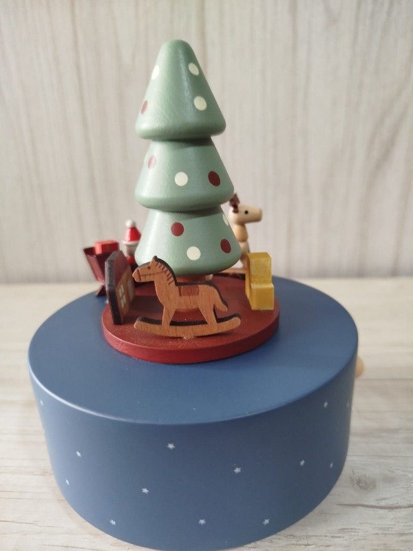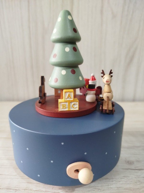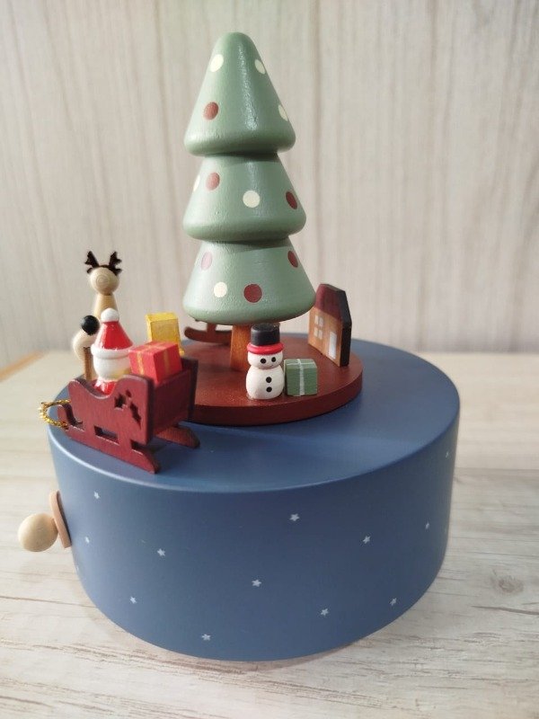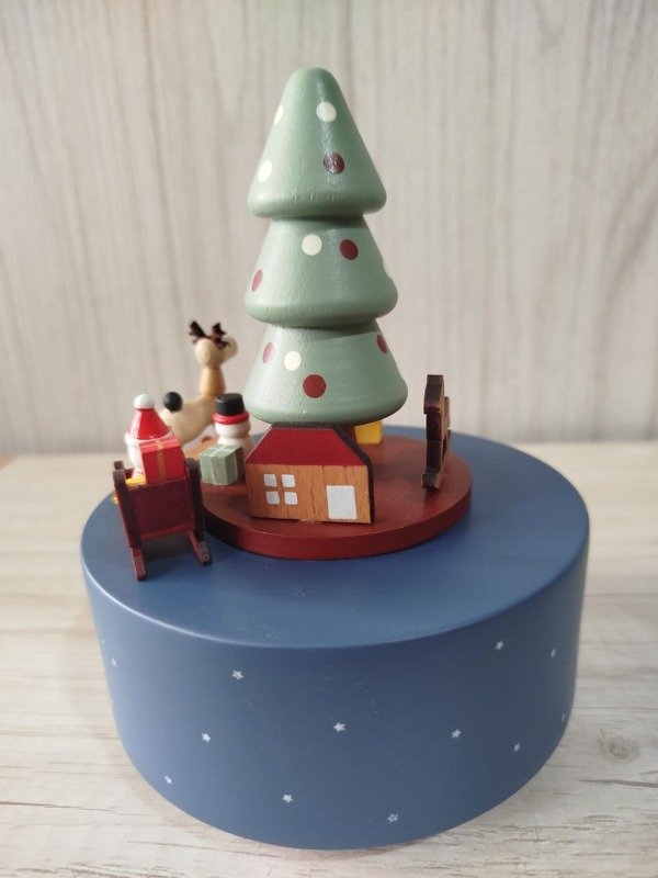 Cajita musical a cuerda, confeccionada en madera de haya, con una excelente terminación, totalmente suave al tacto. Sus medidas aprox. son 11 cm de diámetro de base x 17 cm de alto. Al girar la cuerda suena melodía navideña.