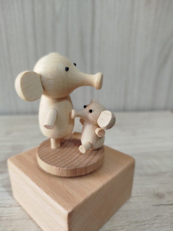 Cajita musical a cuerda, confeccionada en madera de haya, con una excelente terminación, totalmente suave al tacto. Sus medidas aprox. son: base 6,5 cm x 6,5 cm; alto 10,5 cm. Al girar los elefantitos suena una bella melodía.