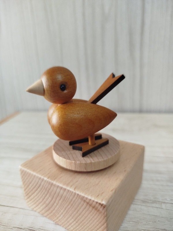 Cajita musical a cuerda, confeccionada en madera de haya, con una excelente terminación, totalmente suave al tacto. Sus medidas aprox. son: base 6,5 cm x 6,5 cm; alto 10 cm. Al girar el pajarito suena una bella melodía.